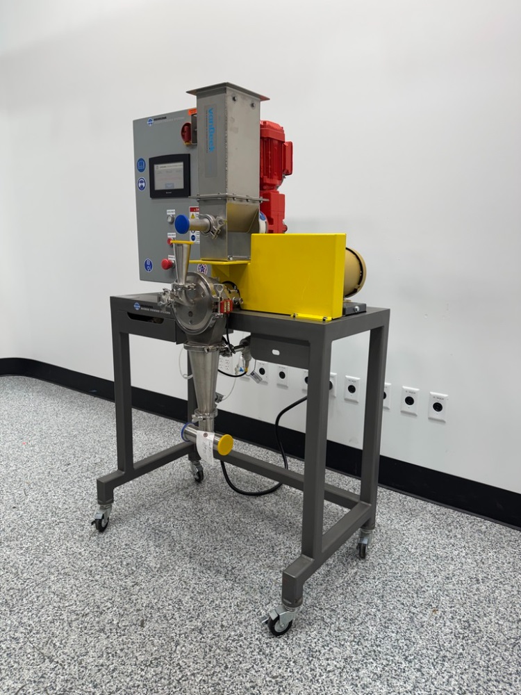 1-Used Hosokawa Micron Powder Systems “MIKRO-UMP” Universal Milling System, Model UMP-8. With touchscreen control panel with rotor type selection, SEW Eurodrive motor, Baldor Reliance Speed Motor LM355T, with 3 HP, 3/60/230-460 2490 RPM and Van Beek TR25 screw conveyor. On mobile frame with casters. (Stock #L2033)