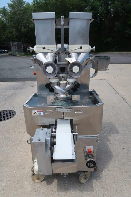 1 – Used Rheon “Cornucopia” Model KN300 Encrusting machine. On casters for portability, the machine has extended hoppers and 3/60/220 Volt electrics. With side mounted control box, the machine was last used in a bakery production plant. (Stock # 8770A)
