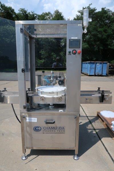 1-Used Chamunda Pharmatech Automatic Plug Inserter, Serial Number 1158-2020. Rated up to 50 containers per minute, this stainless steel cabinetry machine has integral conveyor with plastic tabletop chain. Equipped with bowl feed, machine last running approximately 21mm diameter plug/insert. Electrical specifications single phase, 220 Volt. (Stock #8888K)