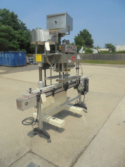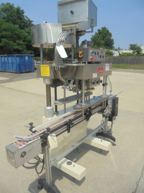 1-Used Kaps-All Model A6 Six Spindle Automatic Screw Capping Machine, S/N 4303. Rated up to 150 containers per minute, Capper has top mounted stainless steel Centrifugal Bowl Feeder and stainless steel Bulk Supply Cap Hopper. Equipped with Self-Contained Control Panel with variable speed controls, Capper has 3/60/220 volt electrics. For placement over customer’s existing Conveyor, Capper can be supplied with Conveyor shown in photographs at additional cost. (Stock #8120C)