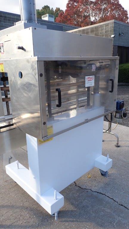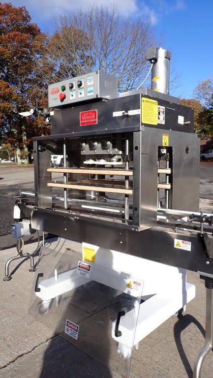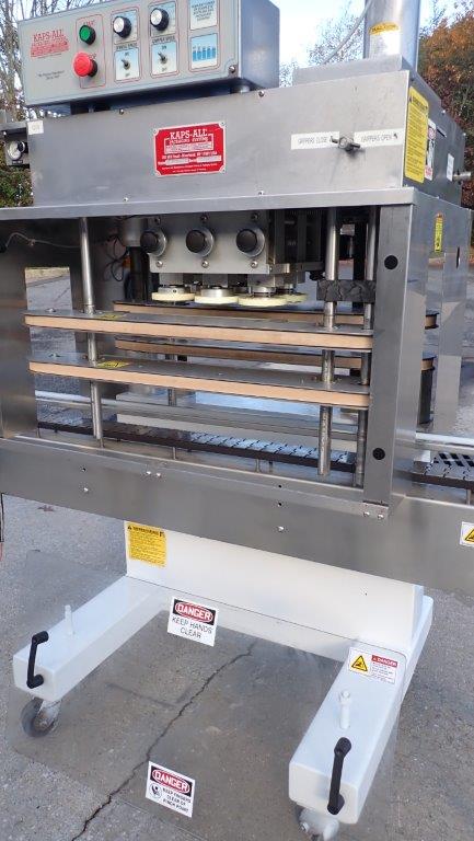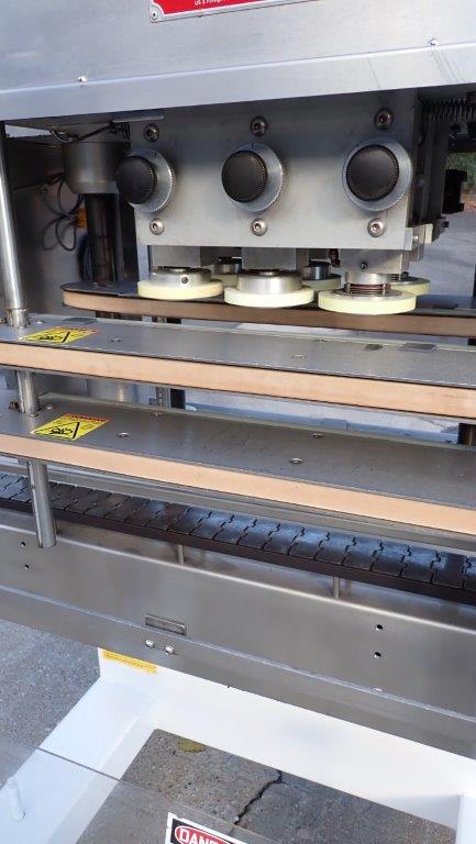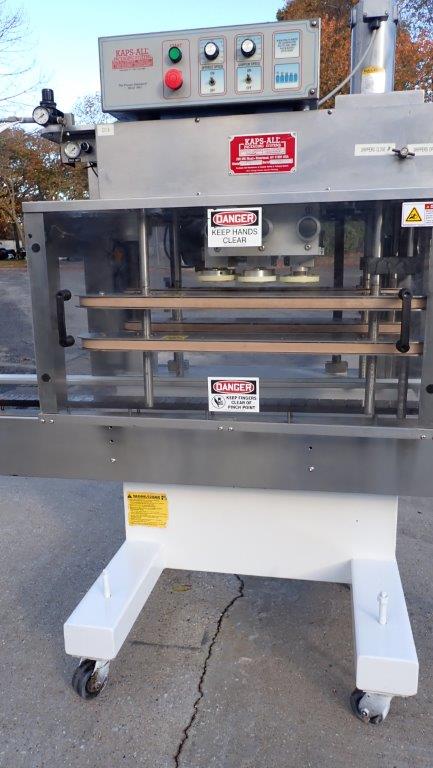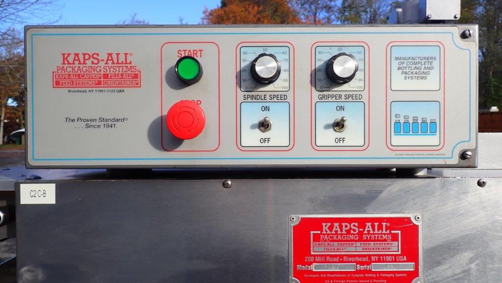 1-Used Kaps-All Model FA-6 Six Spindle Retorquer/Cap Tightener, Serial number 4664. Rated up to 120 containers per minute, machine has two-tier container stabilizing belts as well as Torque Adjustment feature. With front mounted control panel, this retorquer is on casters for portability. Can be placed over customer’s existing conveyor or supplied with conveyor shown in photos for additional charge. Last used in the cosmetic industry, machine has single phase electrics. (Stock #9016A)