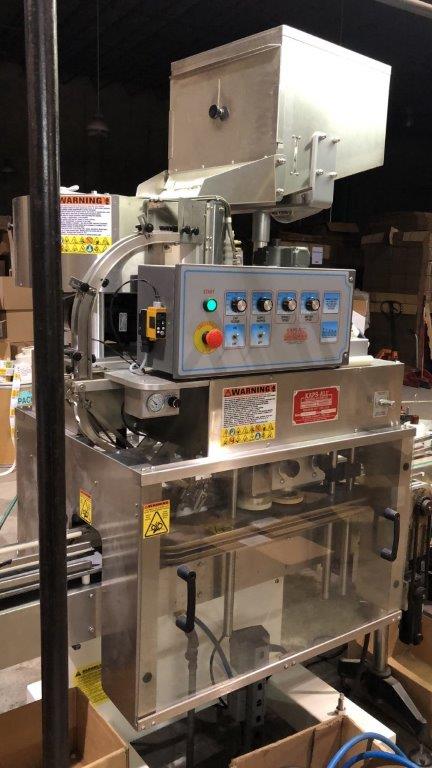 1-Used Kaps-All Model E-4 Four Spindle Automatic Screw Capper, S/N 7568. Rated up to 80 containers per minute, machine is equipped with its own conveyor, top-mounted Centrifugal Feed Bowl and Bulk Cap Supply Hopper. On casters for portability. (Stock # 8500)