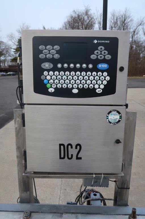 1 – Used Domino Model A100 Inkjet Coder. Mounted on Gottscho “Bottomless” conveyor/gap transporter, machine is on casters for portability, and has single phase electrics.(Stock # 8724C)