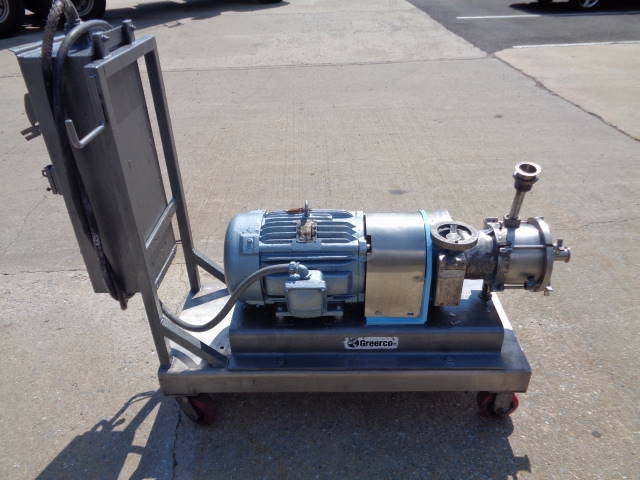 1-Used Greerco W500 H-199 Stainless Steel Horizontal Inline Colloid Mill, S/N 3-04514. Equipped with jacketed stator housing, mill is mounted on portable base with casters for portability. Driven by 10 HP 3/60/230-460 volt 3525RPM explosion proof motor. With non-explosion proof starter box. (Stock #8015A)