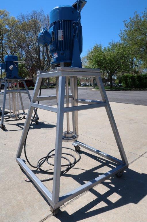 1 – Used Silverson 25 HP Stainless Steel “Drop-In” High Shear Batch Homogenizing Mixer. Driven by 25 HP 3/60/230-460 volt 3,510 RPM Explosion Proof motor, mixer has approximately 32 In. long stainless steel shaft. Last used in personal care products business, machine supplied with portable storage stand shown in photos (Stock # 8636C)