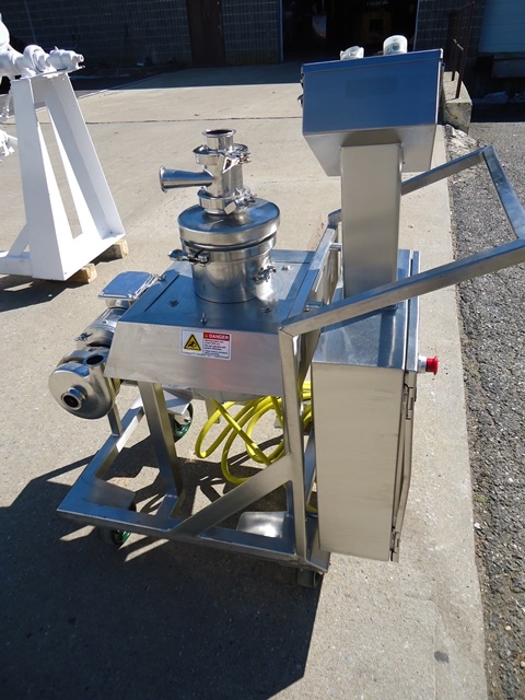 1-Used All Stainless Steel “Tri-Blender”. With approx. 2 in. diameter Tri-Clamp inlet and 1-1/2 in. diameter tri-clamp outlet, machine is mounted on stainless steel stand with casters for portability. Equipped with main drive motor of approx. 3HP, system has stainless centrifugal pump with 1HP motor, pump has 1-1/2 in. diameter tri-clamp inlet and outlet ports. (Stock #8078)