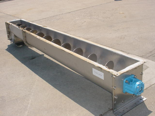 1-Used stainless steel horizontal motorized screw conveyor. Equipped with approx. 11″ diameter x 10′ long stainless steel conveyor mounted in horizontal trough. Driven by 5 hp 3/60/230-460 volt motor and reducer. Screw conveyor has approx. 7″ diameter bottom discharge.