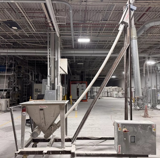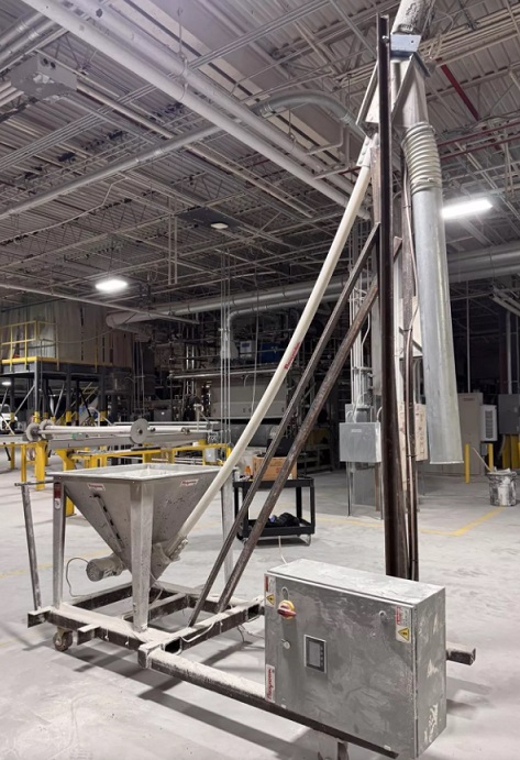 1-Used Flexicon Inclined Flexible Screw Conveyor. Equipped with approx. 3 in. diameter outer flexible tube and stainless steel hopper, unit is on casters for portability. Also equipped with 8 In. internal pre-breaker and PLC Control, discharge height is approx. 10 In. (Stock #9076)