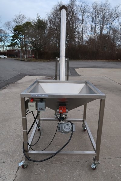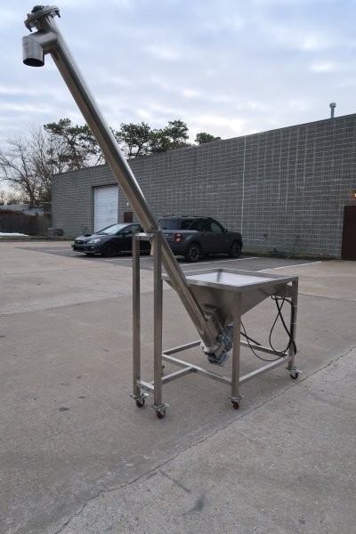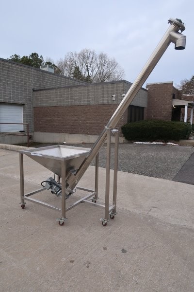 1-Used Inclined Stainless Steel Screw Feeder/Conveyor. With 3 In. diameter screw and vibratory hopper measuring 35 In. X 35 In., unit has discharge height of approx. 88 In. Driven by 3 phase, fractional HP motor. (Stock #9035)