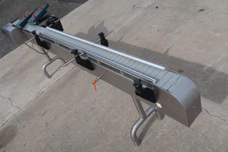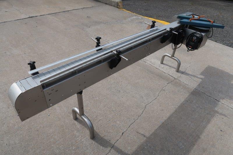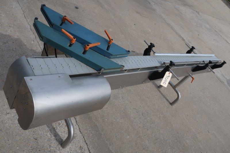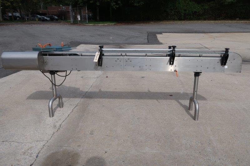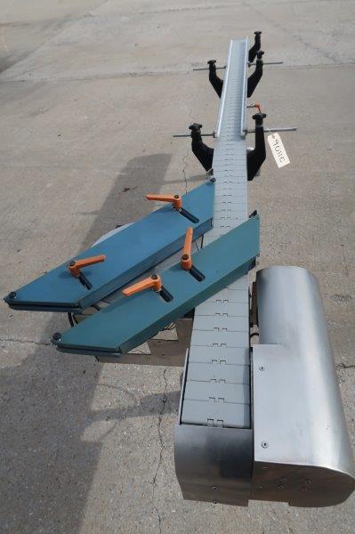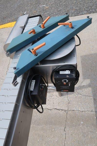 1-Used 9-1/2 Ft. Long Stainless Steel Motorized Bottle Conveyor. Equipped with 4-1/2 in. wide plastic tabletop chain with variable speed control, on Stainless Steel legs. Conveyor is equipped with a motorized Transition disk with guides and variable speed control. (Stock #9011C)