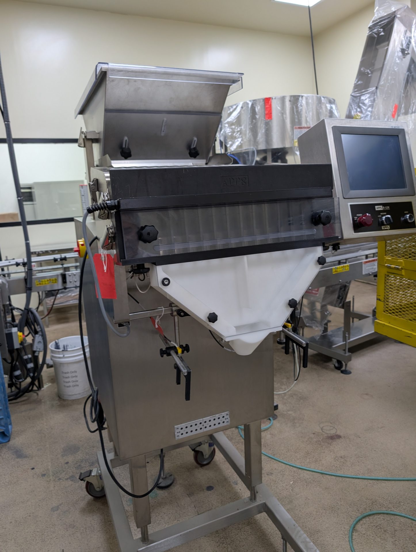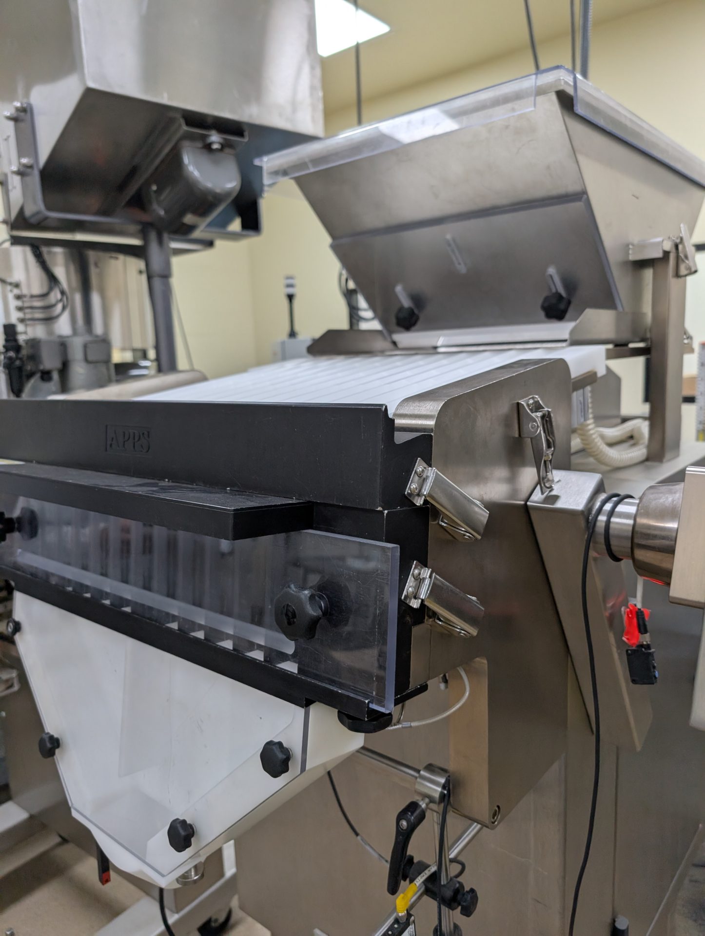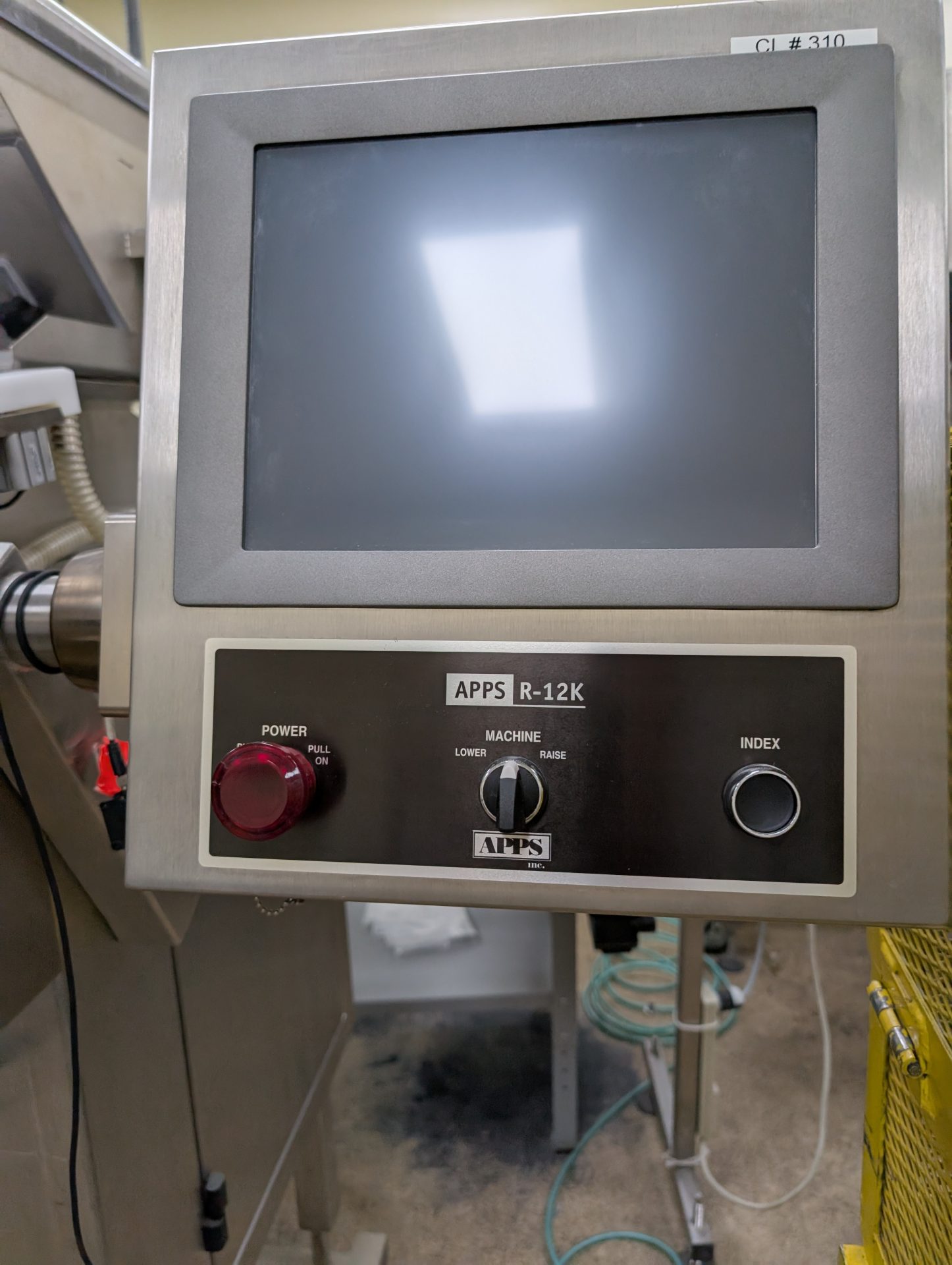 1-Used APPS Model R-12K Stainless Steel Automatic Twelve Lane Electronic Tablet/Capsule Counter, Serial number STF12-030. With side mounted control panel, this GMP machine was last used for the counting/filling of supplements. On casters for portability, counter can be placed over customer’s existing conveyor, or conveyor shown in photos can be supplied at additional cost. With large capacity top mounted hopper, machine has push-button height adjustment and numerous desirable features. (Stock #9019K)