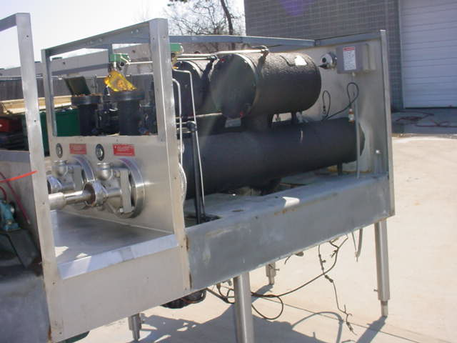 1-Used apv/crepaco twin tube scraped surface heat exchanger, s/n f-6794-2hd-672. Each barrell is 6″ diameter x 72″ long, s/n 89kz0979 and #89kz0980 respectively. Each is rated in jacket 150 psi. Driven by reliance 15 hp 3/60/230-460 volt motor. Unit has front stainless steel panel with assorted gauges.