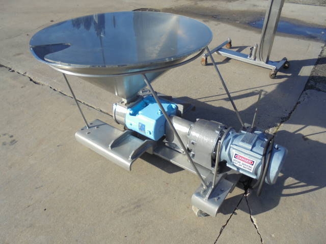 1-Used G&H Products Stainless Steel Positive Displacement Gear Pump, Model 2130, S/N 94-12-4139. This hopper fed pump is equipped with a 42 in. diameter stainless steel conical feed hopper and has approx. 2-1/2 in. diameter tri-clamp 90 degree discharge. Mounted on portable base with casters, pump is driven by 5HP, 3/60/230-460 Volt motor. (Stock #8145F)