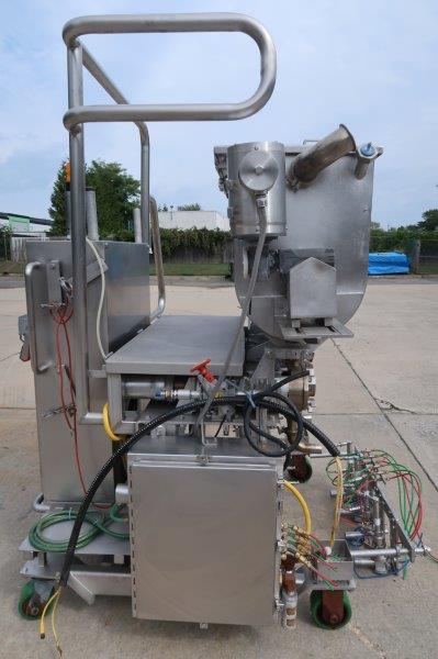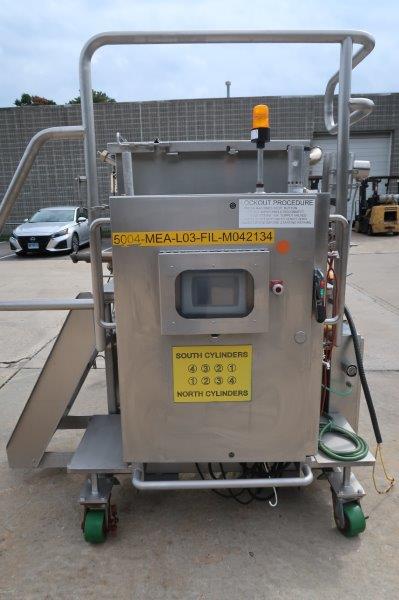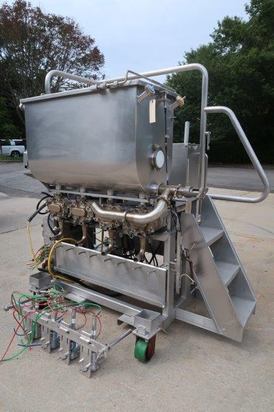 1-Used Hinds Bock Four Head Servo Automatic Pump Style Positive Displacement Filling Machine, 4P-032. Equipped with four lobe type heads, filler is suitable for many different types of viscous products, including products like creams, lotions, salsas, fruit fillings, soups, etc. and other products where there is need to preserve the integrity of the product without damage to any particulates. With Allen Bradley Panelview PLC, filler can be supplied with conveyor shown at additional cost, or placed over customer’s existing conveyor. Last used in the food industry, filler has top mounted stainless steel hopper with horizontal agitation. (Stock #9004C)
