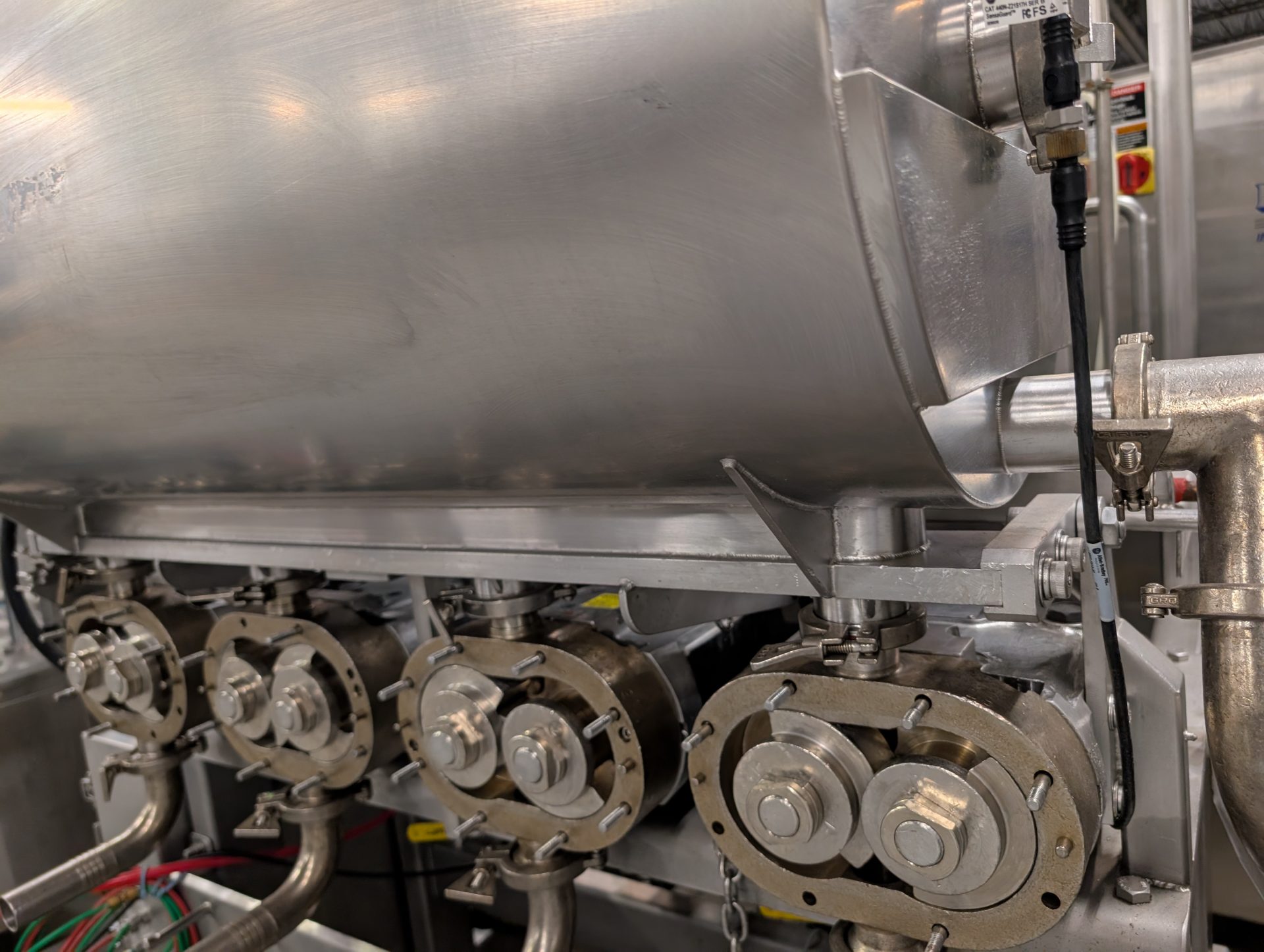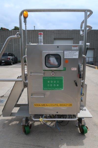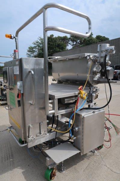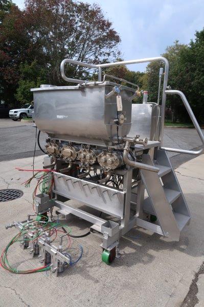 1-Used Hinds Bock Four Head Servo Automatic Pump Style Positive Displacement Filling Machine, Model 4P-036, Serial Number 5944. Equipped with four lobe type heads, filler is suitable for many different types of viscous products, including products like creams, lotions, salsas, fruit fillings, soups, etc. and other products where there is a need to preserve the integrity of the product without damage to any particulates. With Allen Bradley Panelview PLC, filler can be supplied with conveyor shown at additional cost, or placed over customer’s existing conveyor. Last used in the food industry, filler has top mounted 50 gallon stainless steel hopper with horizontal agitator keeping products in suspension. (Stock #9004B)