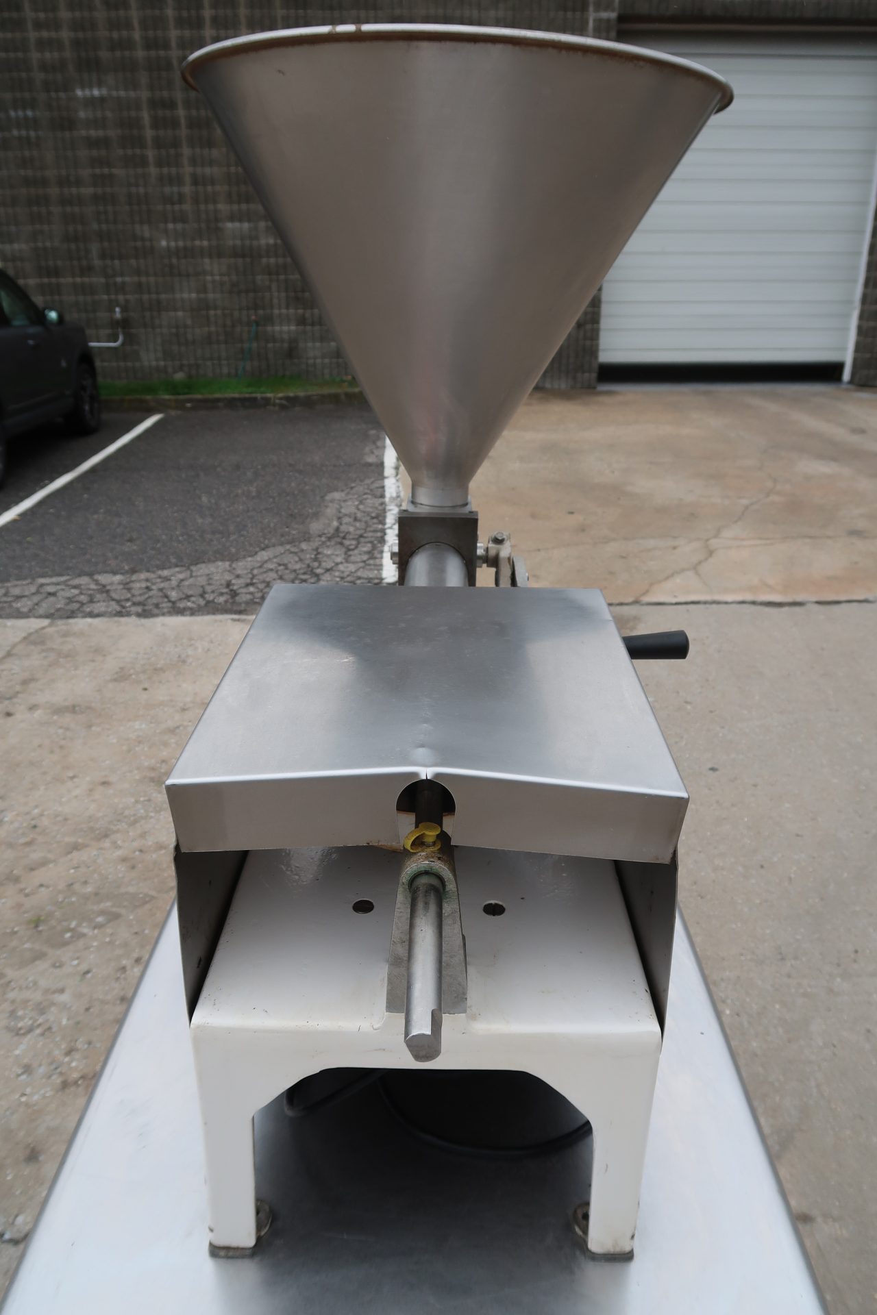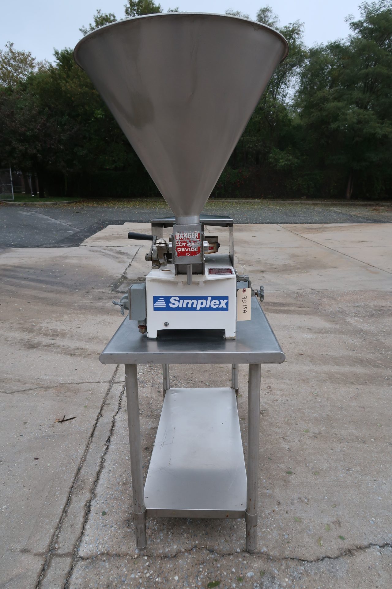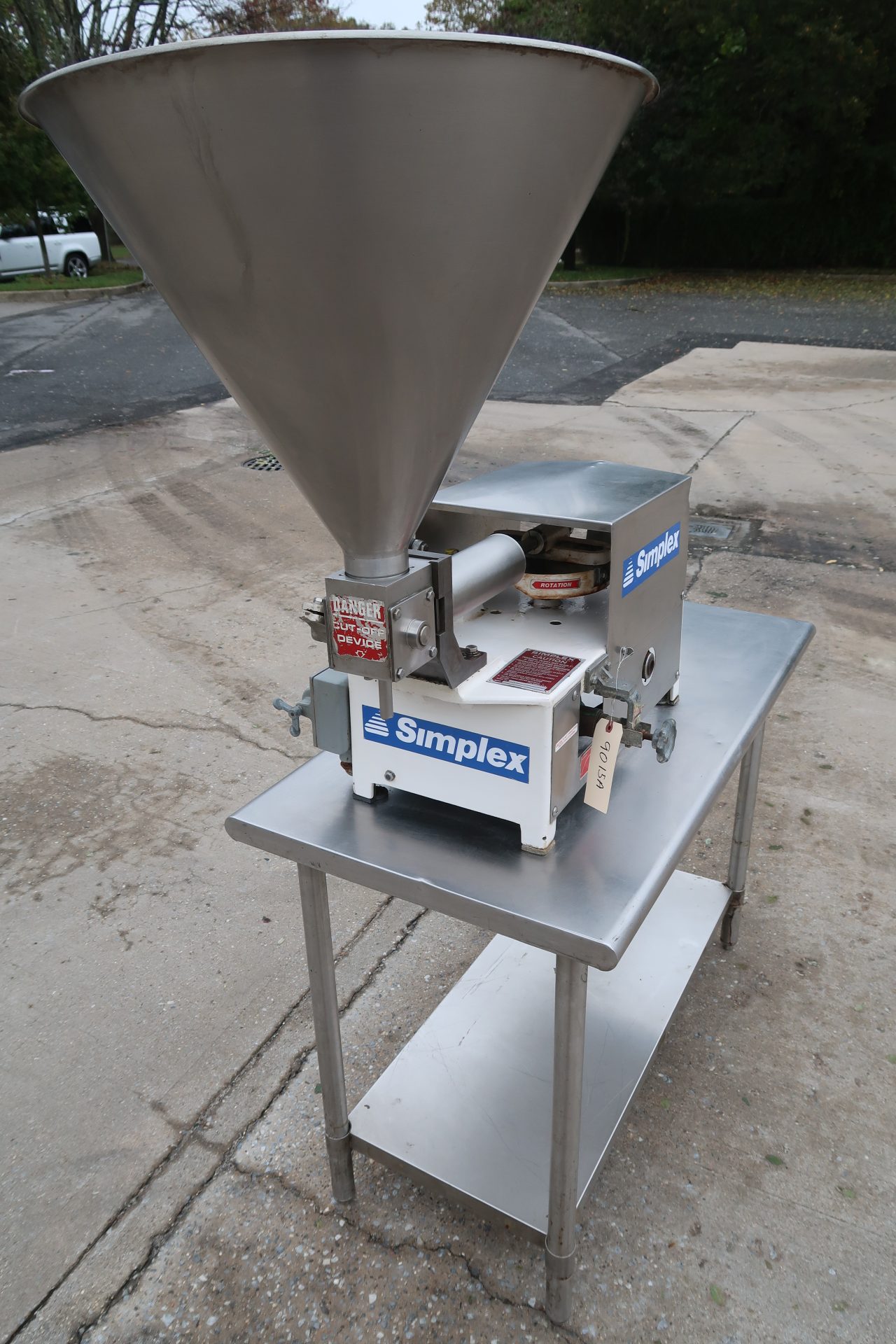 1-Used Simplex Model A-S Semi-Automatic Single Head Piston Filling Machine, Serial Number 6704. Rated up to 25 containers per minute, current filling piston/cylinder measures approximately 3 In. diameter by 8 In.es long. With 22 In. diameter stainless steel top mounted conical hopper, filler has single phase electrics. Last used in the food industry machine can be supplied with stainless steel table shown in photos at additional cost. (Stock #9015A)