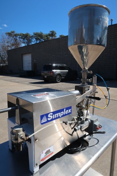 1-Used Simplex Model AS-1 Tabletop Electric Single Piston Filling Machine S/N 7790. Rated up to 30 containers per minute, depending on product, container size and operator’s dexterity, this tabletop filler is equipped with 2-7/8 In. diameter X 9 In. long filling cylinder/piston. Equipped with top mounted 14 In. diameter stainless steel conical hopper. With single phase electrics, filler was last used in a sanitary operation. Table shown in photos is available at an additional cost. (Stock #9051E)