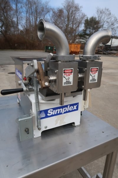 1-Used Simplex Model AS-2 Two Head Tabletop Electric Piston Filling Machine, S/N 8694. Rated up to 50 containers per minute, depending on product, container size and operator dexterity. Last used in a sanitary operation, this electrically operated filler comes equipped with two 2-7/8 inch diameter by 9 inch long stainless steel cylinders, and can be supplied with or without table shown in photos. With single phase electric, this filler can be fed directly to the valves or top mounted hoppers can be supplied at additional cost(Stock #9051F)