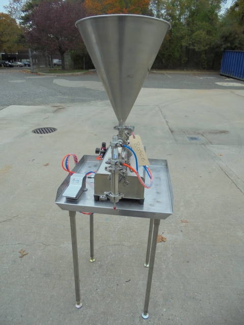1-Used Tabletop Semi-Automatic Single Piston Filler Model SVF1-240, S/N 20110704. This Air Operated Filler can operate up to 20 containers per minute with approx. 16 in. diameter conical product hopper. Filling piston measures approx. 1-3/4 in. diameter X 7-1/2 in. long. Stainless Steel Table shown in photographs available at additional cost. (Stock #8046B)