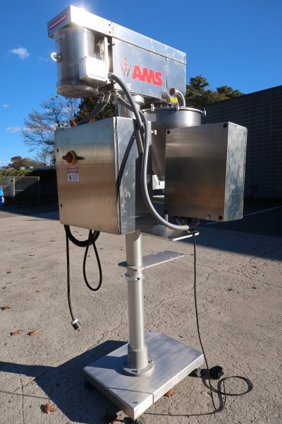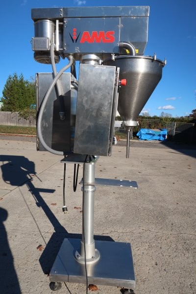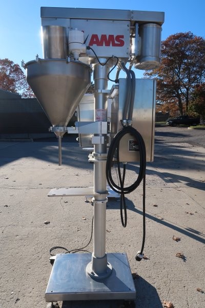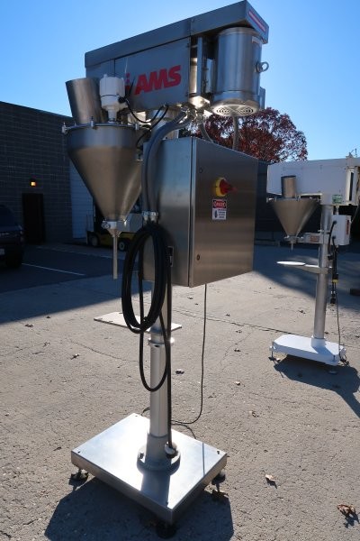 1-Used AMS Model A-100 Stainless Steel Single Auger Powder Filling Machine, Serial Number A-1001472. This semi-automatic filler was last used in filling supplements and is on casters for portability. Equipped with side mounted control panel as well as stainless steel starter box, filler has top mounted stainless steel motor, conical feed hopper and one set of tooling. Supplied with foot pedal for actuating filling cycle. (Stock #9019E)