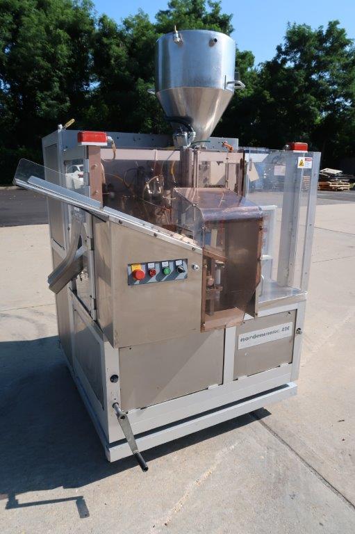 1-Used Norden Model NM400-HA Hot Air Tube Filling and Sealing Machine, Serial number 52405. Rated up to 40 tubes per minute, filler has tube orientation and was last used in the cosmetics industry. Equipped with top mounted stainless steel jacketed hopper, machine currently has tube holders to accommodate approximately 2 inch diameter tubes. Electrical specifications 3/60/230 Volt. (Stock #8529)