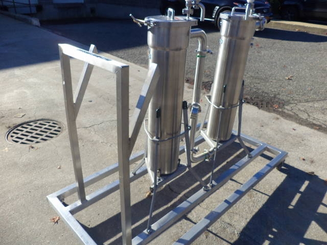 1-Used Alfa Laval Tandam of two (2) 9 in. diameter X 36 in. high Basket Filters. Constructed of Type 316 stainless steel both basket filters are mounted on common stainless steel portable stand. (Stock #7953JJ)
