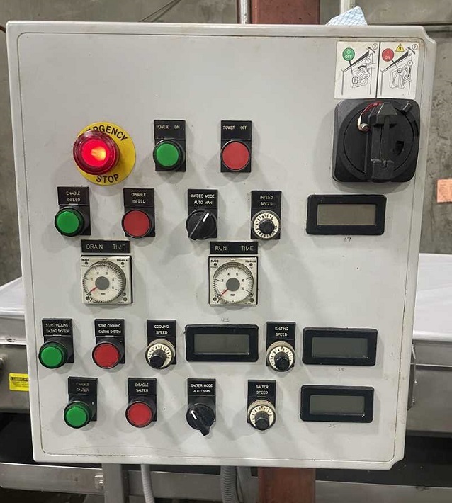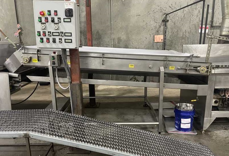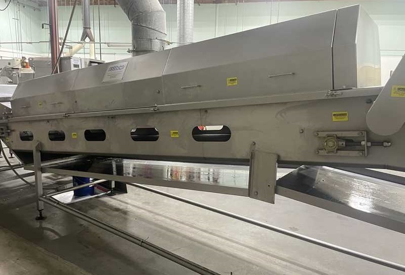 1-Used Foodesign Nut Frying Line. Equipped with batch fryer, line is supplied with infeed conveyor with mesh belt, Foodesign cooling tunnel and Foodesign salter quick coat unit. Further information available upon request.  (Stock #L2059)