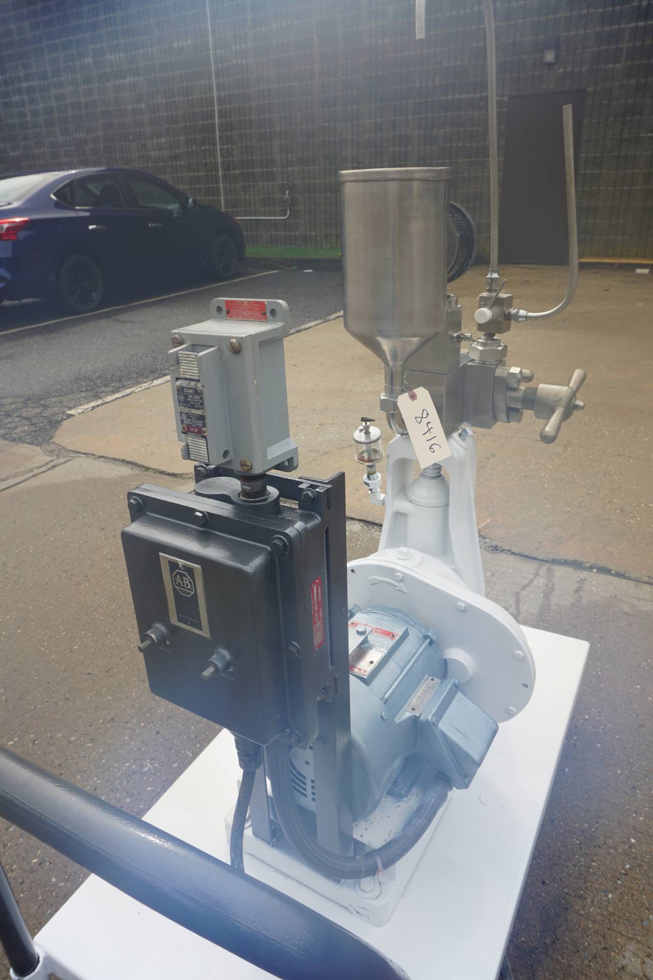 1-Used Gaulin Model 15-8TA Two Stage Explosion Proof Lab Homogenizer, S/N 1797806. rated up to 15 gallons per hour, machine is capable of 8,000 PSI. Driven by 3HP, 3/60/230-460 Volt explosion proof motor. With stainless steel hopper and recirculation pipe, machine is mounted on portable cart with casters. (Stock #8416)