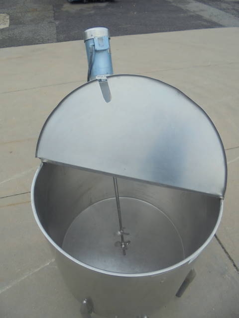 1-Used Steriline Dairy Equipment approximately 250 Gallon Stainless Steel Jacketed Mix Tank Model OVJ-2512-1.5, S/N 4213. Dimensions approx. 45 in. interior diameter X 35 in. deep, Tank has sloped bottom with approx. 1-1/2 in. diameter discharge outlet with valve. With stainless steel agitator mount, Tank with Neptune clamp on agitator mixer with stainless steel shaft and twin 6 in. diameter propellers (available at additional cost). On approx. 18 in. high legs, Tank has two-piece hinged lid. (Stock #8175B)