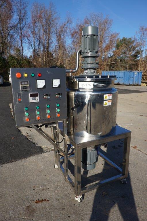 1-Used Ailusi Approximately 30 Gallon Type 316L Stainless Steel Jacketed Dual Action Mix Kettle/Tank. Interior dimensions approx. 20 In. Diameter X 24 In. Deep, Kettle is equipped with scrape surface agitation driven by 1.5kW (2HP) motor, as well as stationary fixed bar agitator. Also equipped with high-speed bottom entering homogenizing head, separately driven by 3kW (4HP) motor. Equipped with stainless steel sectional lid, vessel has stainless steel control panel for temperature display, along with Ammeter, volt meter gauges and variable speed controls for scraper agitation and homogenizing head. With dished bottom, kettle is mounted on stainless steel table with 26 In. high legs with casters for portability. With bottom center outlet with approx. 1-1/2 In. diameter discharge valve with tri-clamp fitting. (Stock #8577A)