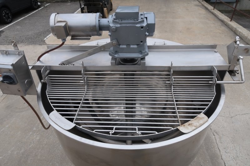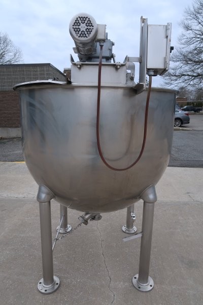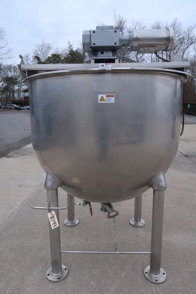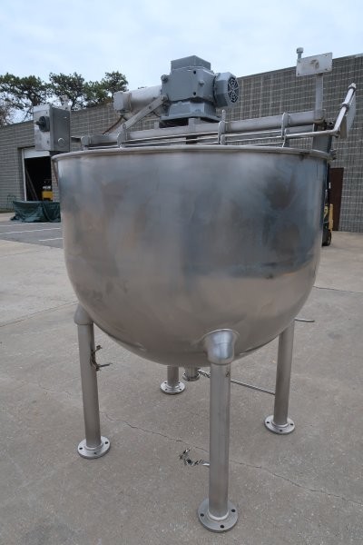1-Used Groen 300 Gallon Stainless Steel Hemispherical Scraper Agitated Kettle, Model RA-300, Serial Number 336197-2.  Dimensions approximately 54 In. diameter X 45 In. deep, kettle is equipped with approximately 3 In. diameter center bottom discharge. With side scraping agitation, kettle was last used in the food industry. Mounted on 32 In. high stainless steel legs, agitation driven by top-mounted stainless steel motor and gearbox. (Stock #9049)