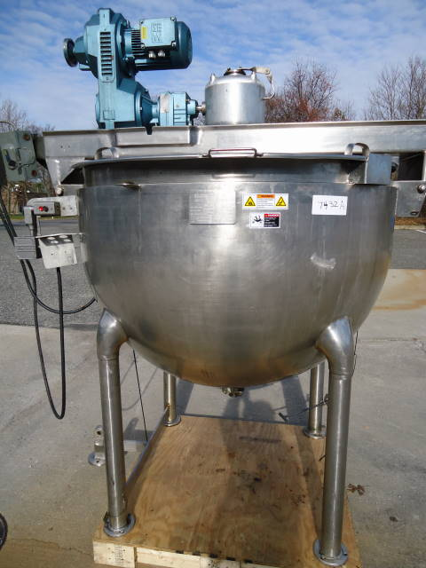 1-Used hamilton 300 gallon stainless steel jacketed double motion mixing kettle, s/n a-4659. Dimensions approx. 56″ diameter x 43″ deep. Kettle is jacketed for 125 psi @ 345 degrees f, national board #1656, code stamped. With double motion scrape surface agitator, kettle has two-piece stainless steel hinged lid and is on approx. 36″ high stainless steel legs. With approx. 2″ diameter center bottom discharge outlet. (stock # 7432a)