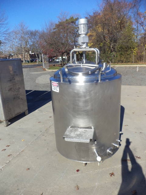 1-Used approx. 300 Gallon Stainless Steel Jacketed Mix Tank. Interior dimensions approx. 44 in. diameter X 56 in. on the straight side plus sloped bottom. With dome top with approx. 18 in. diameter off center manway with lid and six (6) assorted top openings. Tank has sweep agitator and stationary baffle and dual head CIP sprayball. With approx. 2 in. diameter Tri-Clamp bottom discharge. (Stock #7928E)