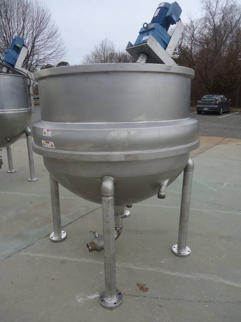1 – used pardo 350 gallon type 316 stainless steel jacketed hemispherical inclined agitated kettle, serial# 4423-2. Dimensions approx. 53 in. Diameter by 46 in. Deep. Jacket rated 100 psi @ 338 deg. F, national board# 2166, code stamped. With insulated type jacket, kettle has inclined agitator top driven by eurodrive, 230/460 volt. With approx. 6 in. Bottom discharge, reduced to 4 in. Tri-clamp with lee 3 inch valve. On stainless steel legs. (stock# 7642d)