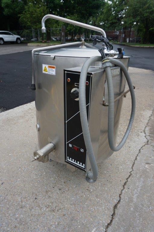 1-Used Garland Commercial Ranges Ltd. 40 Gallon Stainless Steel Jacketed Self-Contained Electric Kettle, KS40F-L, Serial Number 9H10640. Interior dimensions approx. 26 In. Diameter X 24 In. Deep, Kettle is rated 50 PSI Jacket at 298 Deg. F., code stamped. On stainless legs, tank has hinged lid and bottom center tangential discharge outlet with valve. With front mounted panel for temperature control, kettle has side mounted faucet for cleaning purposes. Electrical specifications 3/60/208 Volt. (Stock #8523A)