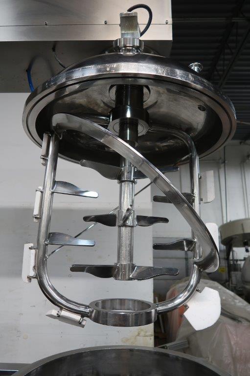1-Used 200 Liter (Approximately 50 Gallon) Jacketed Vacuum Triple Motion Kettle/Reactor, Serial Number E170793. With scraper agitation variable speed up to 50 RPM, vessel has bottom entering 5.5 kW (approximately 7HP) motor for the homogenizing head (variable speed up to 3,600 RPM). With automatic “Lift-out” of counter-rotation agitation, vessel has self-contained vacuum pump, and hydraulic power pack. Electrical specifications 3/60/220 Volt. (Stock #8773F)