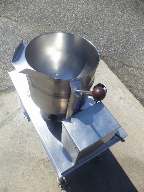 1-Used Groen 5 gallon Stainless Steel Self-Contained Electric Kettle, Model TDB/7-20. Dimensions approx. 14 in. diameter x 12 in. deep. Kettle is jacketed for 50 PSI @ 300 Deg. F., National Board # 79303, Code stamped. Electric specifications single phase, 60 cycle, 208 volt. With tilt discharge, kettle is mounted on portable stainless steel table with casters. (Stock #8005AA)