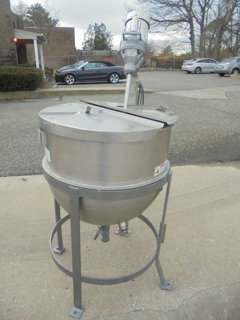 1-Used Toronto Coppersmithing 60 Gallon Stainless Steel Jacketed Kettle, S/N 4665. Dimensions approx. 28 in. diameter X 25 in. deep, Kettle jacketed for 100 PSI. On legs, Kettle has approx. 1-1/2 in. diameter center bottom outlet with valve and two-piece stainless steel lid. Can be supplied with Sharpe 1/2 HP single phase, 60 cycle, 115-208-230 volt Gear Mixer with approx. 10 in. propeller and approx. 8 in. pitch bladed agitator at additional cost. (Stock #8176G)