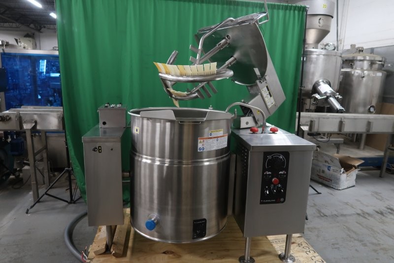 1-Used Cleveland Range 60 Gallon Self-Contained Electric Stainless Steel Jacketed Twin Action Tilt Mixing Kettle, Model MKEL-60-T. With scrape surface agitation, jacket is rated 50 PSI @298 Deg. F. Electrical specifications 3/60/230-460 Volt. Kettle is equipped with both tilt discharge and bottom Tri-clamp discharge. With stainless steel lid, kettle last used in the food industry (Stock #9040A)