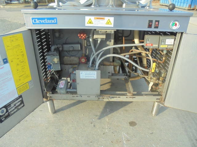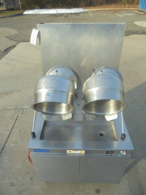1-Used Cleveland Range Model 36-GM-K66-200 (2) Six Gallon Stainless Steel Jacketed Tilt Kettles, S/N 2628528-95B-01. Mounted in cabinet with modular steam generator, kettles require a natural gas source (rated 200,000 BTU per hour) and each Kettle is jacketed for 50 PSI @ 298 Deg. F, National Board and Code Stamped. Each Kettle measures approx. 13 in. diameter x 11 in. deep and overall dimensions of cabinet approx. 34 in. x 34 in . x 35 in. Controls require single phase, 60 cycle, 110 volt electrics. These Kettles quickly and easily cook batches of broths and soups in a neat and efficient manner. (Stock #8060C)