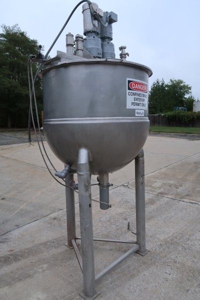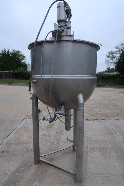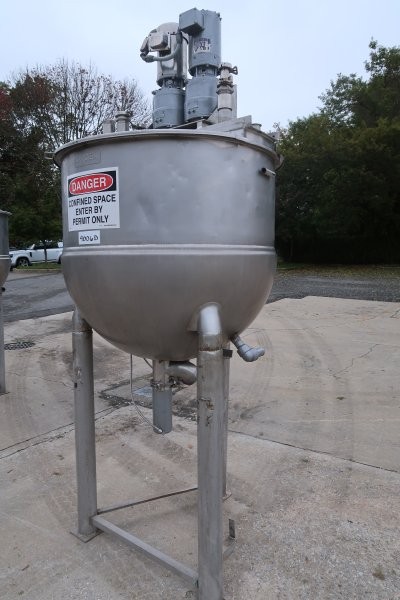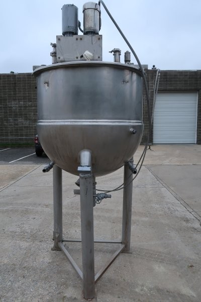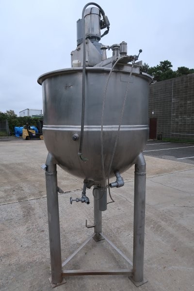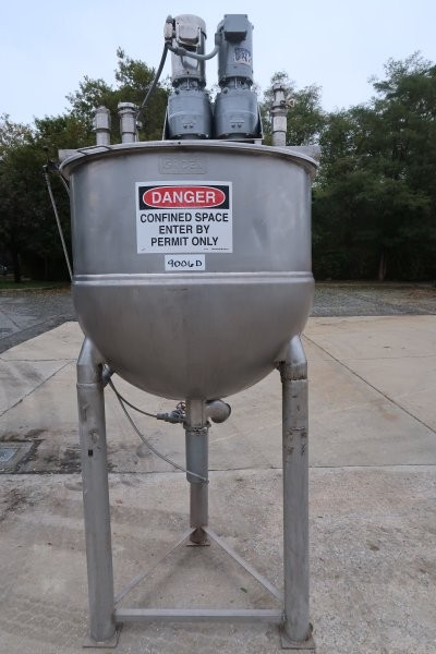 1-Used Groen 200 Gallon Stainless Steel Jacketed Twin Action Mixing Kettle, Serial Number 54096.  Dimensions approximately 44 In. diameter X 41 In. deep, kettle is jacketed for 90 psi@ 338 Deg.  F., National Board and Code stamped. Equipped with side scraping agitation, plus off-center paddle agitation, each independently driven X 1.5 HP electric motors. Mounted on approximately 54 In. high legs, kettle has approximately 4 In. diameter Tri-clamp discharge with automatic valve. With stainless steel hinged lid, kettle was last used in the food industry. (Stock #9006D)