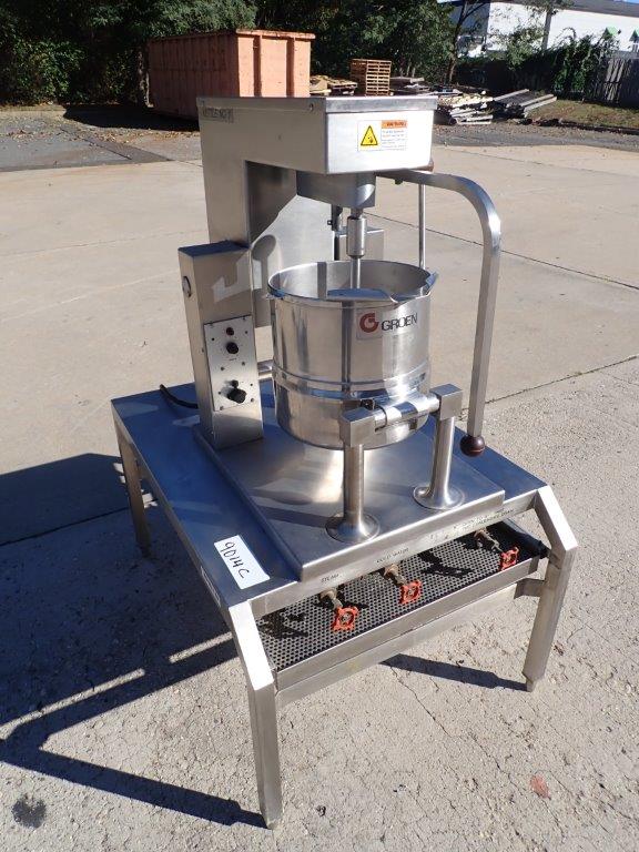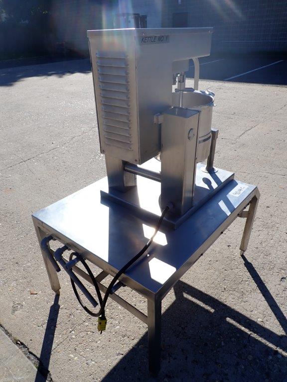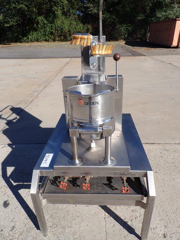 1-Used Groen Approximately 5 Gallon Stainless Steel Jacketed Scraper Agitated Tilt Kettle, Model TDC-3-20, Serial Number 18973. Interior dimensions of kettle approximately 12 In. diameter X 13 In. deep. Jacket rated 55 PSI @303 Deg. F., National Board and Code Stamped. Equipped with scraper “tilt-out” agitator, driven by fractional HP single phase electric motor. Mounted on stainless steel table, kettle was last used in the food industry. (Stock #9014C)