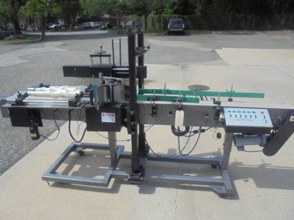 1-Used Autolabe Model 9106 Automatic Front and Back Pressure Sensitive Labeling Machine, S/N 950078. Equipped with Approx. 10 ft. long conveyor belt with 6 in. wide plastic tabletop conveyor chain. On casters for portability, labeler has self-contained control panel and “hold down” belt for stabilizing taller containers. (Stock #8120D)