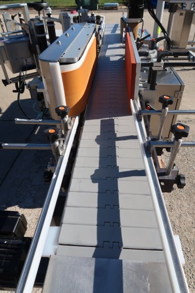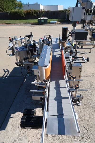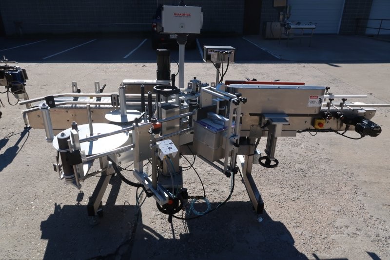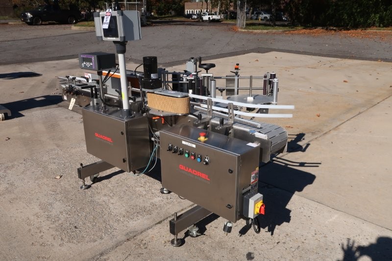 1-Used Quadrel Automatic Pressure Sensitive Spot/Wraparound Labelling Machine, Serial Number 82061-01. Last used at a nutritional packaging facility, labeler has tall wraparound belt for taller containers. With integral large width conveyor with plastic tabletop conveyor chain. (Stock #9019H)
