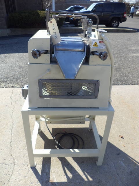 1-Used Ross 4 In. X 8 In. Lab Three Roll Mill, S/N 24060. Mounted on table, Mill has apron and end guides and driven by explosion proof motor. Equipped with safety shut off. (Stock #7979B)
