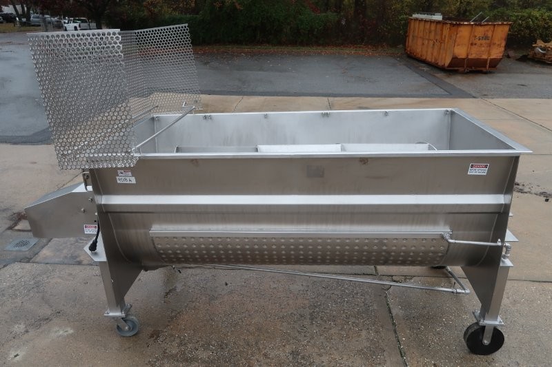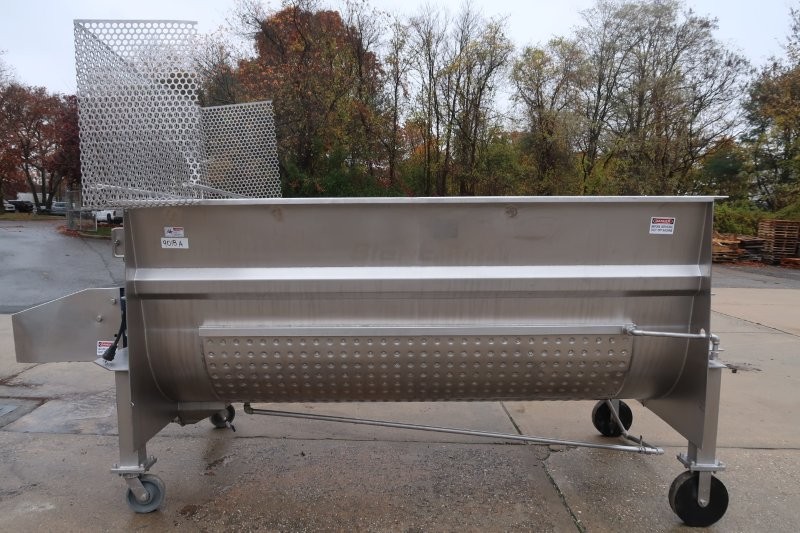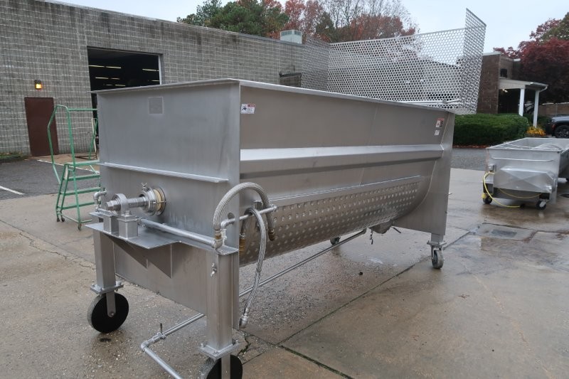 1-Used Blentech 125 Cubic Foot Stainless Steel Jacketed Ribbon Blender, Model SH-125A, Serial number 2110079. Interior trough dimensions approximately 55 In. wide X 120 In. long. Mounted on casters for mobility. With dimpled jacket, blender has 4 inch diameter Tri-Clamp discharge outlet with valve. Driven by 5HP, 3/60/230-460 volt electric motor. Last used in a major food manufacturer (Stock #9018A)