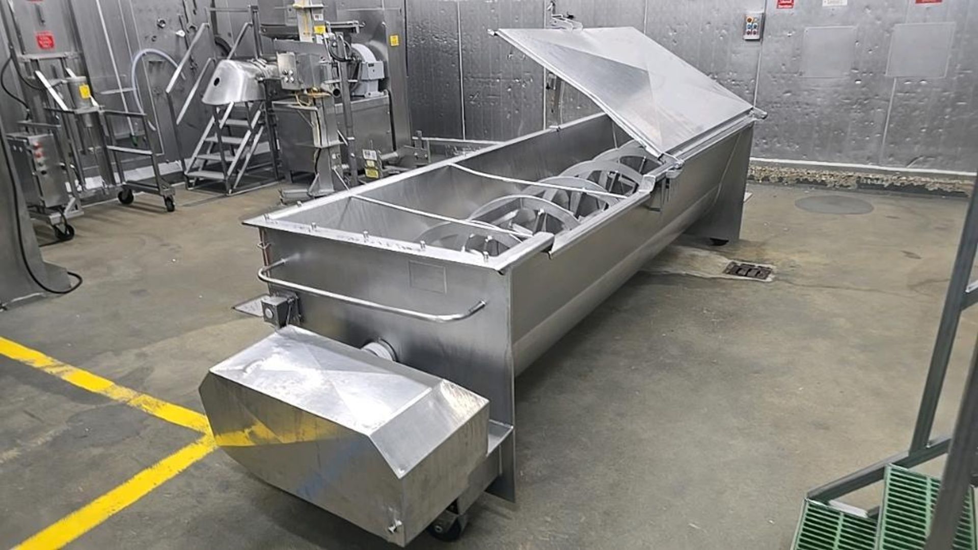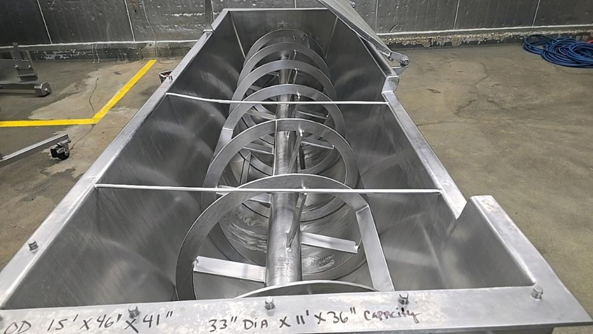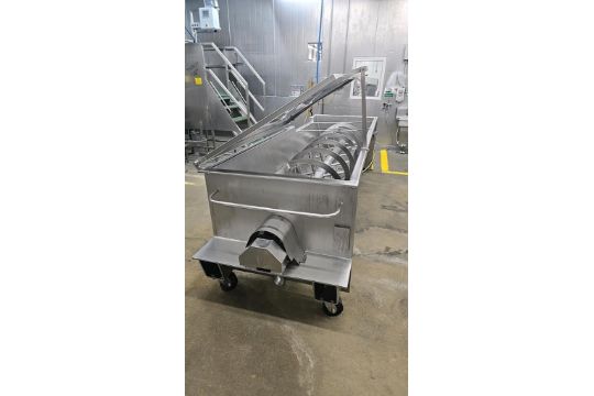1-Used Blentech Single Shaft Ribbon Blender Model SH-064, Serial Number 2100094. Blender has a 4” Tri Clamp discharge, a partially hinged safety lid, and is mounted on casters for portability. This mixer was previously used in the food industry. (Stock #9018B)