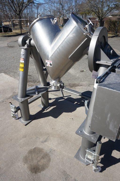 1-Used Patterson Kelley 5 Cubic Foot Stainless Steel Twin Shell V Blender, Serial number 273570. Rated up to 240 lbs./cf maximum density. Equipped with pin type intensifier bar, blender has 3HP 3/60/230-460 volt explosion proof motor, as well as 1.5 HP 3/60/230-460 volt motor. Blender is on stand with leg extensions, providing for approximately 38 inch under-clearance and has 6 inch diameter butterfly discharge valve. Equipped with control panel with variable speed control, and timers. On casters for portability, machine last used in the pharmaceutical industry. (Stock #8475B)