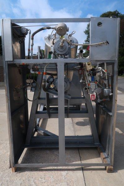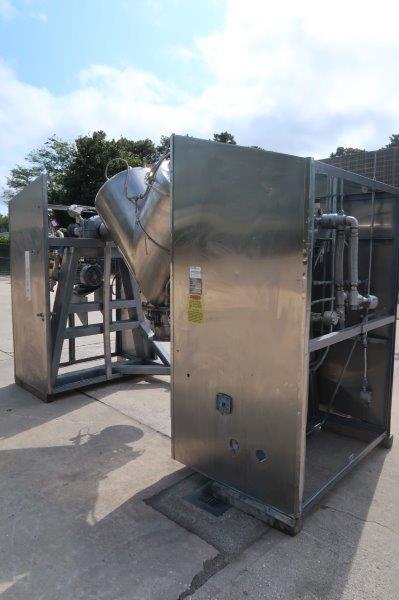 1-Used Gemco 10 Cu. Ft. Type 316L Stainless Steel Twin Shell Vacuum Dryer Blender, Serial number VD-91181. Equipped with 316L stainless steel shell and rated for full vacuum for 10 PSI @ 250 Deg. F., National Board stamped. Rated 60 lbs/cf maximum density. With 304 SS Jacket rated for 30 PSI @ 250 Deg. F to -20 Deg. F., blender is equipped with 5 HP, explosion proof main drive and 3 HP, explosion proof accessory drive for the intensifier bar. Equipped with 6 In. diameter automatic butterfly discharge valve. (Stock #9003A)