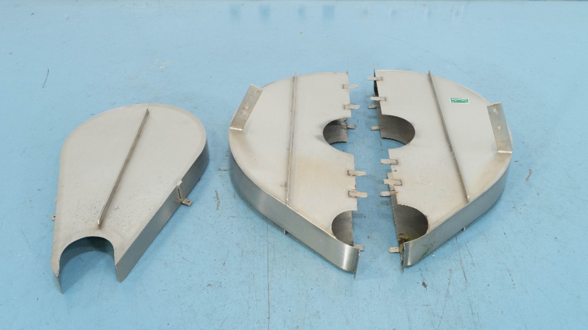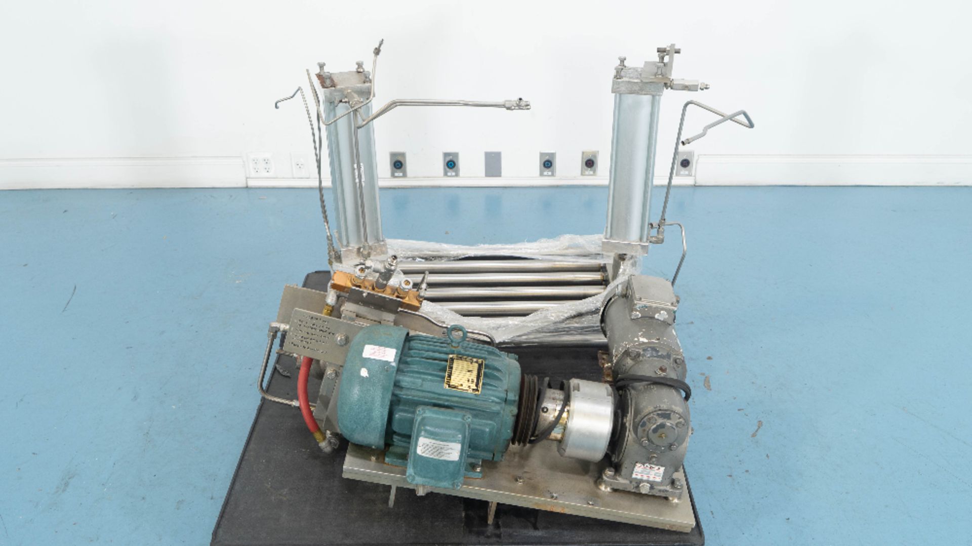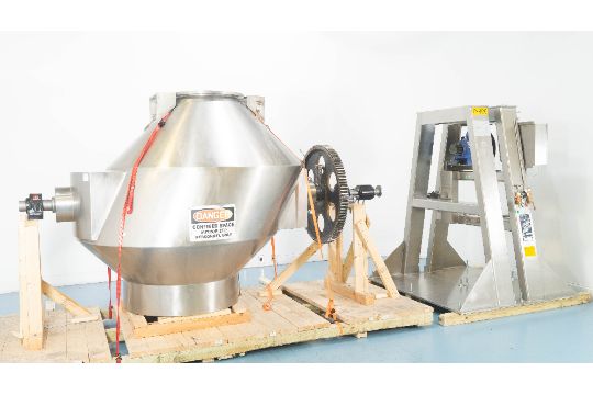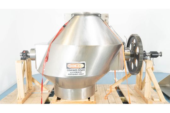 1-Used Gemco 50 Cubic Foot Stainless Steel Slant Cone Tumbling Blender, Serial Number GGM-24035.  With “Gemcomatic” auto drum loading/unloading feature, blender last used in the pharmaceutical industry. On stainless steel legs, blender is rated 70 lbs./cf maximum density.  Electrical specifications 3/60/460 Volt, blender can be shipped assembled or disassembled depending on buyer’s preference. With electric drive motor. (Stock #9031)